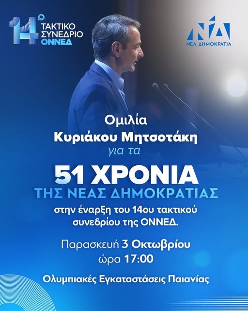 Ομιλία του Πρωθυπουργού και Προέδρου της Νέας Δημοκρατίας Κυριάκου Μητσοτάκη για τα 51 χρόνια της Νέας Δημοκρατίας στην έναρξη του 14ου τακτικού συνεδρίου της ΟΝΝΕΔ.